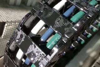Como as cadeias de energia se comportam no óleo? Para responder a essa pergunta de um cliente, a igus® testou o comportamento da e-chain® série B15 em combinação com cinco óleos específicos em seu próprio laboratório de testes. As correntes de energia foram operadas continuamente durante um período de 30 dias e pulverizadas diariamente com os líquidos a serem testados.