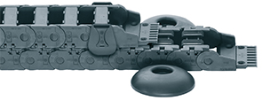 O sistema autoglide foi agora adaptado e otimizado para a gama E2/000 da igus®. O aumento da superfície deslizante através de uma maior largura das travessas autoglide garante uma maior duração de vida do sistema. Uma aba deslizante de encaixe garante o alinhamento seguro da calha articulada nos primeiros metros do curso. Os suportes guia excêntricos estão fixos ao chão a cada 2 metros.