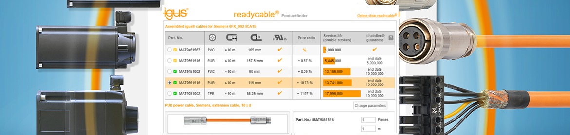 O localizador de produtos readycable® com cálculo imediato da vida útil dos cabos de acionamento selecionados:
