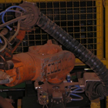 Os movimentos apertados de torção ocorrem especificamente na cabeça do robô. Neste caso, o triflex® R limita a torção dos cabos com a parada de torção definida, e distribui a torção ao longo de um comprimento maior. Isto aumenta a vida útil das mangueiras e cabos.