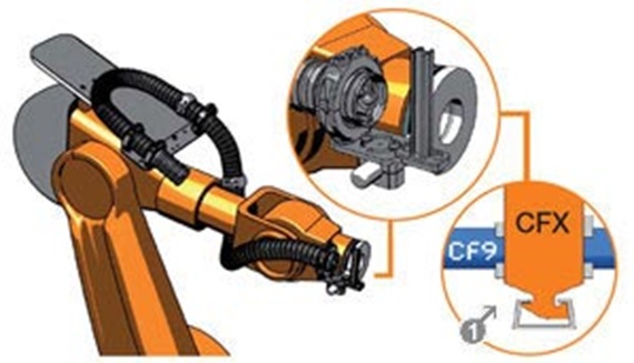 Fastening on the additional axis on the robot. Strain relief through CFX strain relief clips on the double C rails