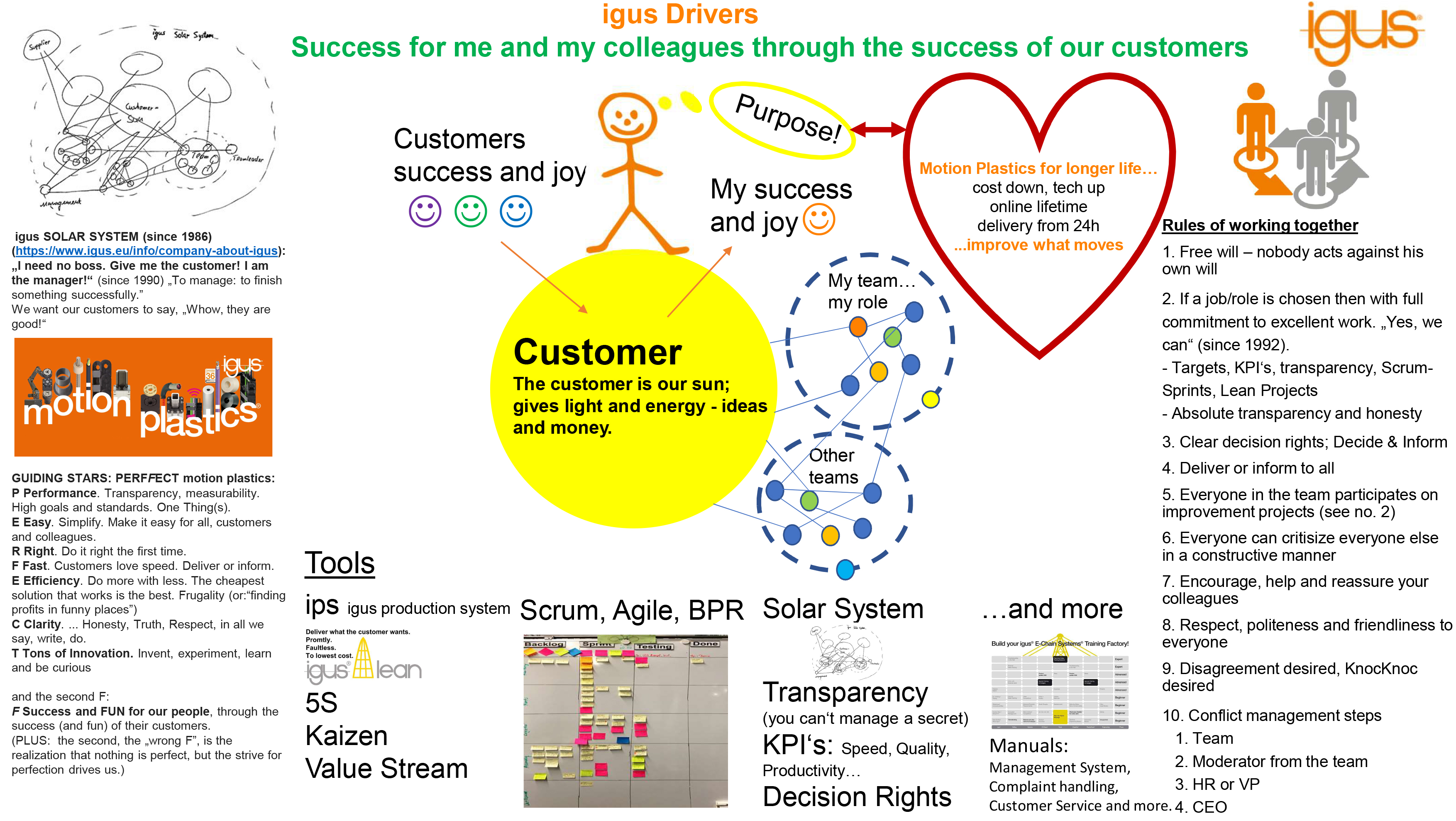 Os condutores da igus mostram em uma página o que precisamos como orientação e ferramentas para o nosso trabalho. Além do sistema solar, os condutores contêm a estrela-guia "Perffect" para nossos clientes, bem como regras para a cooperação interna. Nosso objetivo final: o sucesso de nossos colegas por meio do sucesso de nossos clientes!