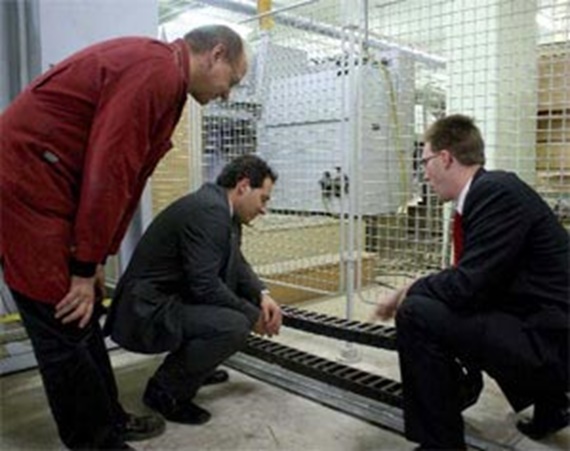 from left: Johann Doler, Technical Department Manager at ADA, with the two igus® employees Gerald Weber and Hans-Jürgen Schram inspecting an e-chain®.